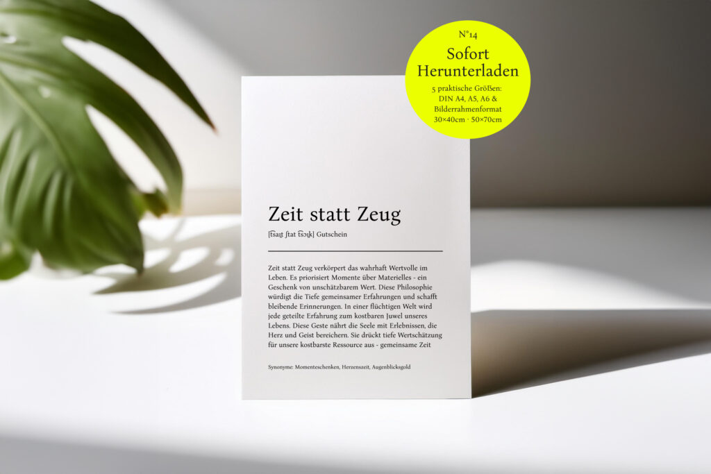 Anstatt Kram zu verschenken, warum nicht „Zeit statt Zeug“? Diese minimalistische Geschenkkarte ist perfekt für alle, die lieber gemeinsame Momente statt Dinge im Schrank haben 💛.